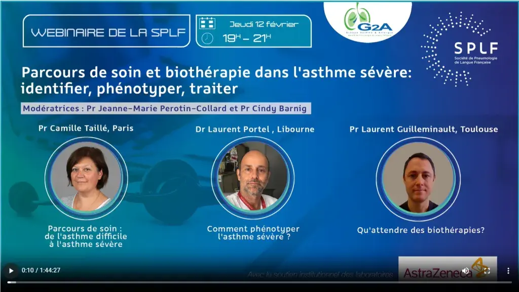 Le webinaire du 12/02/26 de la SPLF (Société de Pneumologie de Langue Française) sur le parcours de soin et les biothérapies dans l'asthme sévère avec le Pr Camille Taillé, le Pr Laurent Guilleminault et le Dr Laurent Portel est disponible en replay.